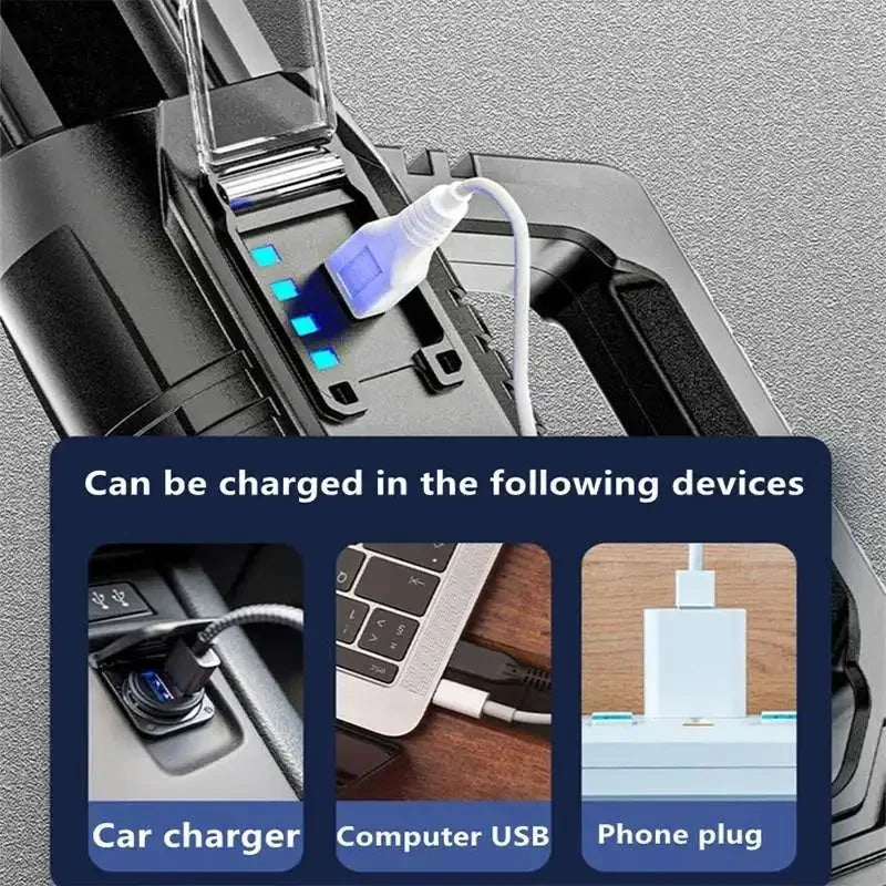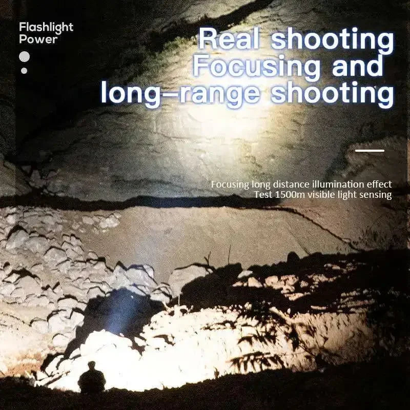 Equipped with a powerful P100 LED chip, this flashlight delivers an ultra-bright, concentrated beam with a range of 800–1000 meters, ensuring clear visibility even in complete darkness. -